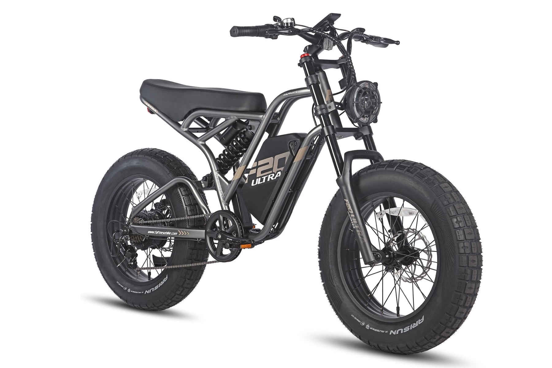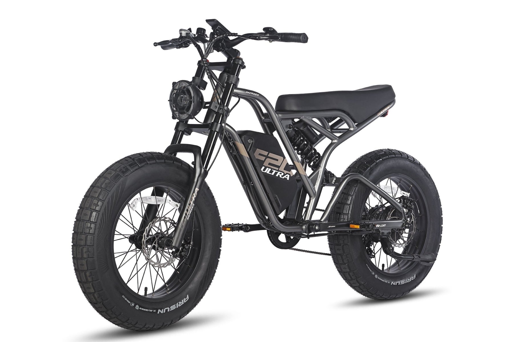 Oversized 20×5.0 fat tyres and dual suspension (front fork & rear shock) absorb bumps and deliver smooth rides across city streets, sand, and trails.